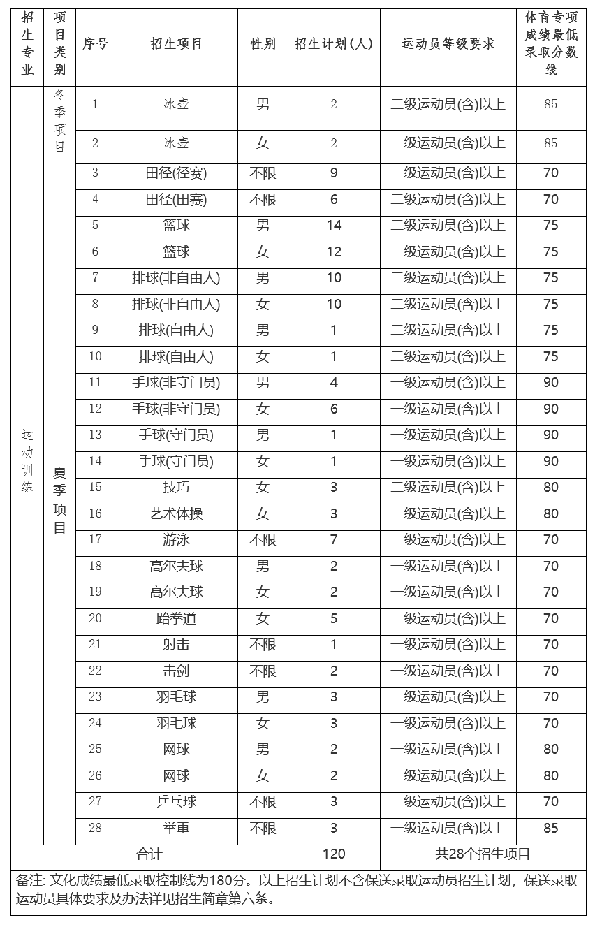 (二)体育专项成绩最低录取控制线:手球项目90分;冰壶、举重项目85分;技巧、艺术体操、网球项目80分;篮球、排球项目75分;其他项目70分。具体见各项目招生计划表。