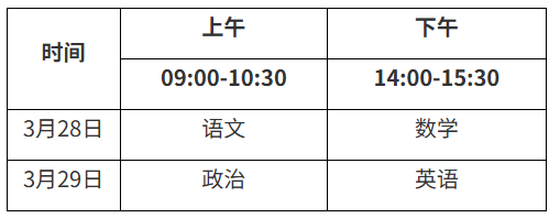 考生按照准考证上的考点信息于2026年3月28日至29日参加文化考试。文化考试时间安排如下: